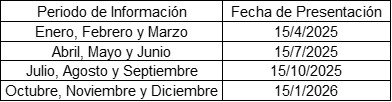 Deberán presentar la declaración jurada en forma trimestral, en las fechas que se indican en el cuadro siguiente. La información será suministrada por mes calendario.